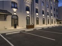 This stock photo showcases the car park of an outdoor business center at dusk in a large building illuminated by street lamps. The city's architecture and asphalt roads create a vibrant urban setting. The residential building's facade and windows add to the charm of the scene. The plaza is well-lit, and the guard rail along the road surface ensures safety. The suburban surroundings blend seamlessly with the urban design. The parking lot is bathed in the warm glow of street lights, creating a classic architectural ambiance. The artificial light adds depth to the city life captured in this image. The dark shades and tints create an intriguing atmosphere.