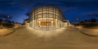A fish-eye view of the Martin Center, a modern glass building in East Tennessee. The night-time photography by David Wilson captures the city's architectural beauty. The clear sky and contrails add to the urban ambiance.