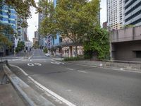 a empty empty street is lined with trees and buildings that have fallen over the side