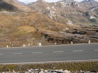 the asphalt road is lined with rocks in front of the mountains, surrounded by a grassy hillside