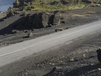 An elevated asphalt road winds along the rugged coastal landscape of Iceland. The road surface contrasts with the black volcanic bedrock and lush green grass. The clear sky and mountainous backdrop create a breathtaking view.