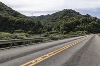 This is an image of an empty road in the scenic landscape of New Zealand. The road is surrounded by lush forests and mountains. In the distance, there is an elevated bridge with an Armco barrier. The sky is filled with white clouds, creating a picturesque scene. This photo captures the natural beauty of New Zealand and represents a peaceful day in the countryside of New South Wales. The power pole adds a touch of modern infrastructure to the otherwise untouched wilderness of Wairarapa.