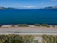 This aerial view photo showcases an elevated coastal road in Mallorca, Spain. The clear blue sky and clear waters of the ocean add to the magnificent landscape. In the distance, you can see the stunning mountains surrounding the area. A motorcycle is parked near the front, ready for a ride along the high asphalt road. This image perfectly captures the beauty of nature and the scenic charm of the Balearic Islands in Europe.