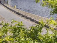 This is an image of a modern cityscape in Berlin, Germany. The photo captures the city's unique architecture and urban design, with high-rise buildings and modern structures reflected in the calm waters of a river. The city is adorned with lush vegetation and green spaces, including grassy areas and trees. The photo was taken during the day, with sunlight illuminating the landscape. In the foreground, cobblestone streets and a jetty can be seen, adding to the charm of the urban environment. This image represents the combination of modernity and nature in Berlin.