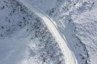 An aerial view of a snow-covered mountain slope in Europe. The glacial terrain is surrounded by trees and a high ice cap. A top-down perspective showcases the elevated road and off-road tracks, inviting nature lovers for recreational activities.