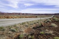 This image captures the rugged beauty of the Canyonlands in Utah, USA. The photograph shows an empty road winding through the desert, with mountainous terrain in the distance. A lone white truck is seen traveling along the road, creating contrails of dust behind it. The vegetation and plant community are scarce in this natural environment, characterized by red rock walls and elevated canyons. The landscape is truly mesmerizing, showcasing the untouched beauty of Utah's nature. This photo represents a typical day in the desert, where the road surface meets the vastness of the desert landscape.