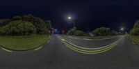A straight, elevated road in a suburban area of New Zealand. Artificial lights illuminate the dark night, contrasting with the clear sky above. Residential suburbs line the road, with green grass in the middle.