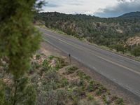 An aerial view of an elevated road in rural Utah, surrounded by stunning mountainous landscapes. The clear sky and high position provide a breathtaking perspective of nature in the USA.
