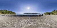 Elevated skateboard ramp in Wellington, New Zealand. The coastal landscape provides an open space for skateboarders with a panoramic view of the ocean. The clear sky enhances the natural beauty of the park area.