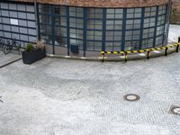 This is an image of a tall brick building in Germany, situated behind a street curb covered with traffic barrier barriers and parking spaces. The surrounding area showcases classic European architecture and urban design. The road surface is made of cobblestone, adding to the charm of the city landscape. The elevated courtyard provides an open space for city life activities. This photo captures the high-energy and dynamic atmosphere of an urban environment in Germany.