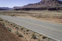 An elevated view of a red rock desert landscape in Utah, USA. Clear sky and highland vegetation contrast with the asphalt road surface. The road winds through the high line canyonlands, offering a breathtaking view of Lake Powell and Hite.