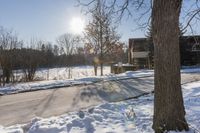 This stock photo showcases an elevated view of residential homes nestled alongside a high-road in Ontario. The road, made of asphalt, winds through the picturesque countryside, and the surrounding landscape is covered in a blanket of snow. The clear sky above reveals a bright sun visible through the bare branches of the trees. Despite the freezing winter temperatures, the sunlight adds a touch of warmth to the scene, creating a serene and peaceful atmosphere.
