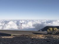 Elevated view of a man standing on top of a hill in Tenerife, Spain. The highway below meanders through the mountainous landscape, with clouds floating in the clear sky above. A breathtaking day in Europe's highlands.