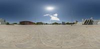 an empty concrete plaza is shown in a 360 - fish eye lens with bright blue skies