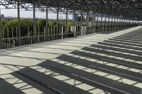 A view of Toronto's urban landscape, showcasing the architecture of a parking garage. The elevated structure contrasts with the clear sky above. The symmetrical design and parallel lines create a sense of order. Trees and vegetation provide shade and highlight the open space below.