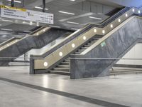This stock photo captures an empty airport terminal in Berlin, Germany. The modern architecture of the building features a spacious open space with concrete flooring. The design includes sleek lines, glass walls, and steel handrails. A subway station with escalators and an underground parking deck can be seen in the surroundings. The ceiling is made of aluminium, adding to the contemporary feel of the space. This image is perfect for illustrating travel, transportation, and architecture concepts in Europe.
