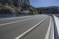 the empty highway is running alongside the rock cliff wall as a cyclist rides down it