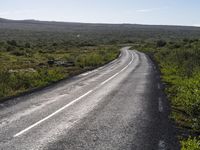 This stock photo features an empty, asphalt road running through an arid landscape in Iceland on a sunny day. The road stretches far into the horizon, surrounded by vast grassy plains and woody plants. The clear sky above showcases a few scattered clouds and contrails. The scenic beauty of Iceland, a stunning island located in Europe, is captured in this serene nature image.