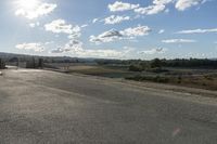 a empty asphalt road with a hill in the background under a cloudy blue sky and sun