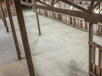 An empty barn interior with wooden beamed flooring and roof. The high ceiling and rustic design highlight the architectural beauty of this rural structure. Clear sky illuminates the space with artificial light. Perfect for country-inspired furniture and design.