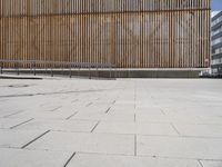 This stock photo showcases an empty bench located in Berlin, Germany. The modern architecture and open space create a visually stunning scene. The day lighting highlights the intricate lines and patterns on the wooden flooring and tile. The road surface and concrete curb add to the overall design of the space. This image represents the essence of modern European design, with a focus on wood walls and contemporary aesthetics.