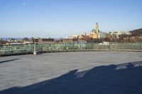 This stock photo features some empty benches on a concrete patio overlooking a stunning cityscape in Montreal, Quebec, Canada. The view is magnificent, with a clear sky and the beautiful city skyline serving as a backdrop. The open space and paver surface provide a serene and inviting atmosphere for tourists to relax and enjoy the breathtaking overview of the city.