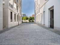 This stock photo features an empty street with cobblestones and buildings in Berlin, Germany. The road surface is made of pavers, and the urban design of the area is modern and vibrant. The clear sky and clouds above add to the city life atmosphere. The residential area is surrounded by bushes and trees, with windows and fixtures visible on the buildings. The architecture in this urban alley-way is a mix of modern and traditional styles. This image captures the essence of urban living in Berlin, Europe.