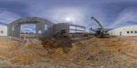 a pair of construction trucks are moving around an empty building site with other trucks on the side
