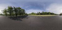 A wide-angle view of an empty car parking lot surrounded by lush green grass and trees. The asphalt surface glistens under the clear blue sky. A perfect spot for recreational activities near a serene lake.