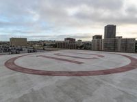 This stock photo features an empty circular parking lot, located in the bustling city of Los Angeles. The futuristic architecture of the surrounding buildings creates a visually stunning skyline. In the background, you can see clouds floating in the sky, adding to the beauty of the scene. The image captures the essence of urban life, with a touch of modern architecture and a break of day's dawn. The concrete surface of the parking lot, along with a visible helipad, gives the image an urban and business district feel. This photo is perfect for representing city life, urban design, and the vibrant business atmosphere in Los Angeles, USA.