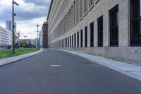 A classic architecture street in Berlin, Germany. Empty road lined with buildings on both sides. Urban landscape with sidewalks covered in grass. Clouds fill the sky on a bright day in Europe.