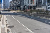 This stock photo features an empty street lined with buildings in the background of a busy cityscape. There is a well-maintained bicycle lane on the side of the road. The architecture around is a mix of modern high-rise buildings and residential areas. The scene takes place in Toronto, Ontario, Canada. It is a perfect representation of urban life in the city, with clear sky and vegetation adding to the charm. The photo captures the essence of urban design and the bustling city life in Toronto. The image was taken during autumn, as indicated by the fallen leaves on the road and the window displays in the buildings. It also illustrates the well-maintained road surface, curbs, and sidewalks, portraying the meticulous attention paid to urban infrastructure.