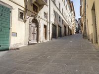 This stock photo depicts an empty city street in Italy, showcasing the classic architectural style of Tuscany. The road is lined with residential buildings, creating a charming neighborhood. Two motorcycles are parked on either side of the road. Some people can be seen walking along the street, adding a sense of liveliness to the scene. The road surface is made of cobblestone, reflecting the historical infrastructure of the urban area. The photo was taken during daytime, allowing ample natural light to illuminate the surroundings. A garden can be spotted nearby, bringing a touch of greenery to the urban setting. This captivating image captures the essence of urban life in a picturesque Italian town.