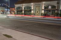 This stock photo features an empty city street at night in Los Angeles, California, USA. The image showcases a red fire hydrant and a white building, adding a pop of color to the urban landscape. The asphalt road and concrete sidewalks reflect the artificial light from streetlights, creating a captivating atmosphere. The motion blur in the foreground suggests the fast-paced city life. The photo captures the essence of residential architecture in a suburban area, with classic designs and modern touches. The ambiance is perfect for a relaxing evening stroll or enjoying a meal at a local cafe or restaurant in the art district of the city. The streetlight streaks add an artistic touch to the scene, making it visually captivating.
