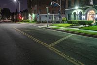 This stock photo features an empty city street at night in Los Angeles, California, USA. The image showcases a well-lit road surface with street lights and neon lights along the sidewalk. The classic architecture of buildings in the background adds to the urban design of the scene. The residential area is calm and peaceful, with cars stopped at the intersection. The mixture of artificial light and darkness creates a captivating ambiance, giving a glimpse into city life. A hotel can be seen at the corner of the street, adding to the charm of the suburban neighborhood.