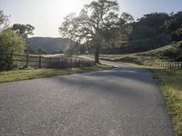 An empty country road in California, lined with a fence and surrounded by lush green grass and trees. The low sunlight casts long shadows on the road surface, creating a serene and peaceful rural landscape.