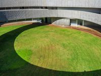 This image features an empty courtyard in Tenerife, Canary Islands. The courtyard is adorned with lush green grass and surrounded by a concrete building. Two circular windows add a touch of architectural interest. The grassy lawn provides a pleasant open space for relaxation and leisure activities. The composition includes a combination of natural and man-made elements, creating a harmonious landscape. The high rectangle building and composite material flooring provide a modern urban design. The vegetation, including leafy plants, hedges, and shrubs, adds to the overall beauty of the biome. The image showcases a land lot with a grass surface and a slight slope, creating an interesting visual. The sunlight casts a hard shadow, enhancing the contrast of the scene. This captivating image captures the essence of Tenerife, an elevated paradise in Europe's Canary Islands.