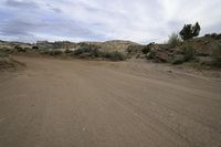 an empty dirt road runs through the desert and has small shrubbery and bushes in the distance