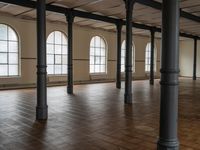This stock photo features an empty floor with multiple large windows in a building. The building is surrounded by several brick columns, giving it a classic architecture look. The interior is spacious and well-lit, perfect for a residential or commercial property. The wood flooring adds a touch of warmth to the space, while the large windows let in ample natural light during the day. The building's design and interior layout make it ideal for various purposes, such as a factory, warehouse, or storage facility. The open floor plan leaves room for endless possibilities, whether it be for interior design projects or setting up fixtures for specific activities like ballet dancing.