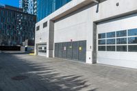 This photo shows an empty garage set up on the side of a street in front of a modern building in Montreal, Canada. The city life and urban vibe of Montreal are reflected in the scene, with the shadow of the building creating an interesting play of light and dark. The road and driveway leading to the garage indicate the hustle and bustle of city life. The modern architecture and urban design of the building highlight the contemporary vibe of this business district. This image captures the energy and dynamism of Montreal, making it perfect for illustrating urban, architecture, business, and modern architecture concepts.