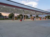 An empty gas station with a concrete surface and artificial lights overhead. People standing by, looking out onto the street. Clouds in the sky on a bright day.