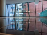 empty glass platform in the middle of an atrium with several buildings outside, reflecting the reflection