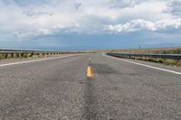 an empty highway with yellow line going through it and clouds in the background on either side of it