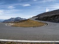 an empty highway goes through mountains in this picture with clear skies above them and grassy hills