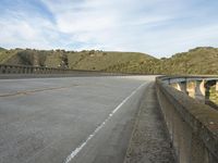This stock photo showcases an empty highway near the mountains and a bridge at the end of the road. The view is captured from the sidewalk, providing a unique perspective. The image, taken at dawn, features a scenic landscape with asphalt road cutting through the nature-filled surroundings. Lush trees and hills can be seen on both sides of the road, while a guard rail adds to the infrastructure. The cloud-filled sky forms a beautiful backdrop for this road trip scene. The road surface, made of concrete, leads to the elevated bridge ahead. It's a perfect representation of a thoroughfare in California, USA.
