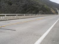 This stock photo features a stunning view of an empty highway in California, USA, with towering mountains in the background. The scene is illuminated by daylight, showcasing the natural beauty of the landscape. The road runs parallel to the coastal waters, providing a picturesque coastal view. The asphalt road surface is lined with guard rails and leads to a bridge, showcasing the infrastructure of the area. The image captures a tranquil moment in the mountainous Big Sur region, along the scenic Pacific Coast Highway. The grey sky adds a touch of drama to the concrete street. This visually appealing photograph is perfect for illustrating themes such as nature, landscapes, road trips, and California's scenic beauty.