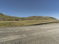 An empty highway in rural Iceland, surrounded by vast plains and mountains. The clear sky and vegetation add to the serene landscape. The road surface and Armco barrier provide a safe journey through the European countryside.