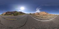 two cars driving down an empty road under a clear blue sky above a desert with the sun shining