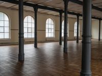 an empty large room with wooden floors and tall windows above them is a huge space in which all different types are displayed