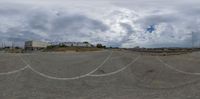 a fish eye view of the empty lot and buildings on the other side of the road